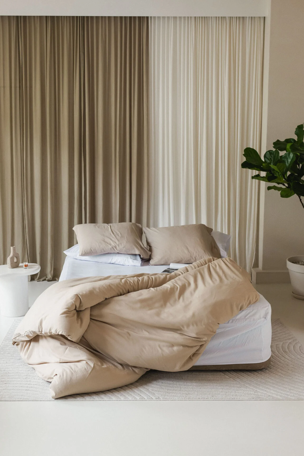 De shoot vond plaats in onze eigen studio, waar we volledige controle hadden over licht, setting en styling. Dit stelde ons in staat om de dekbedden op de best mogelijke manier vast te leggen, met een uitstraling die perfect aansluit bij de luxe en verfijning van het merk. De beelden zijn specifiek ontwikkeld voor gebruik op de website, zodat NÉARR online een consistente en hoogwaardige uitstraling heeft.